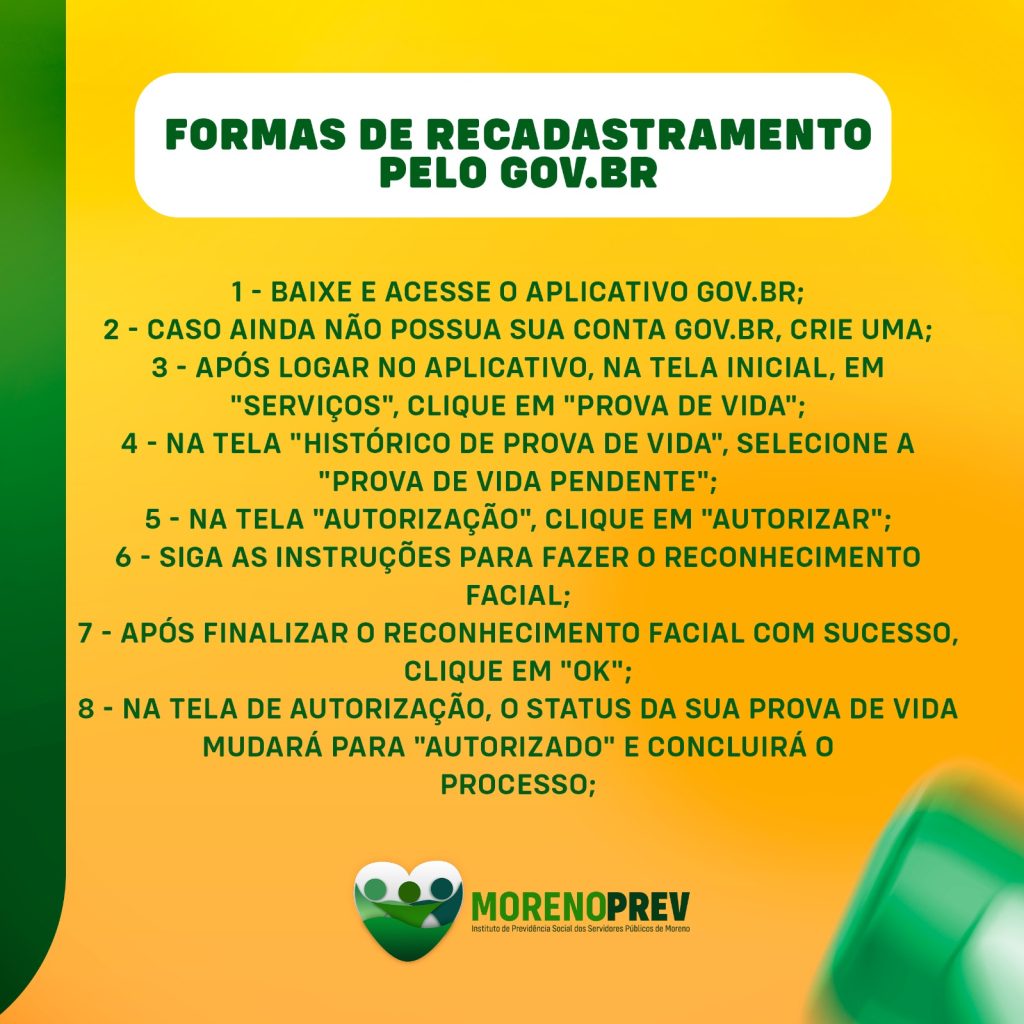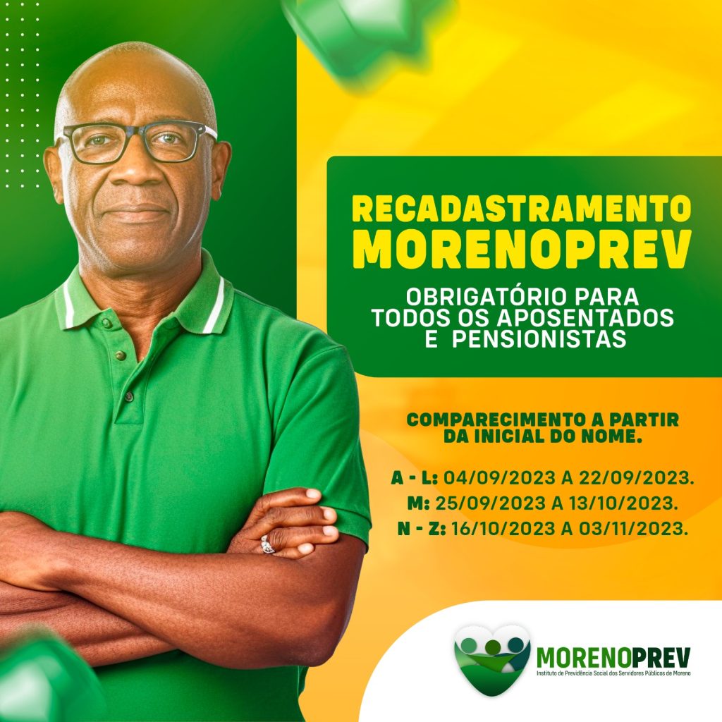O MorenoPrev, no dia 04/09/2023, iniciou o recadastramento dos servidores aposentados e pensionistas para o exercício de 2023. A sua realização é obrigatória e todos os servidores aposentados e pensionistas deverão realizá-lo presencialmente, pelo MorenoPrev, pelo Aplicativo GOV ou por procuração pública, representado por terceiros. Os beneficiários deverão fazer o procedimento conforme a letra inicial do seu nome. Mais informações nos Cards de informação.