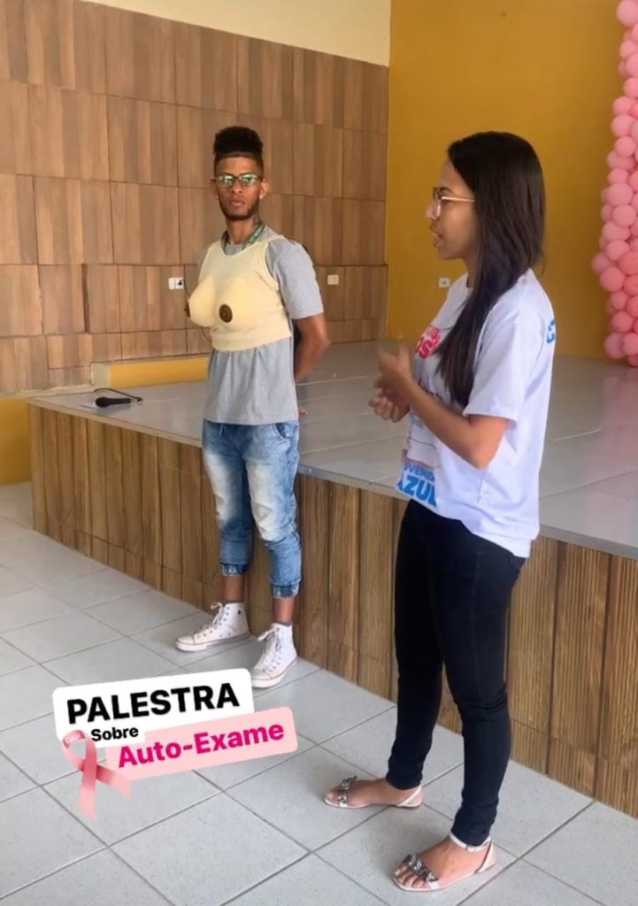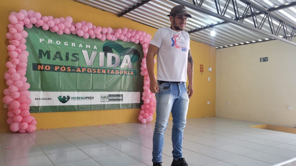 Enfermeira Roberta Thais ensinando como fazer o autoexame para prevenção do câncer de mama em evento promovido pelo MorenoPrev do Outubro RosaFisioterapeuta Rafaela Andressa explica técnicas de relaxamento às servidoras aposentadas do MorenoPrevEducador Físico Elyton Neves dá uma aula de alongamento às servidoras aposentadas no Outubro Rosa